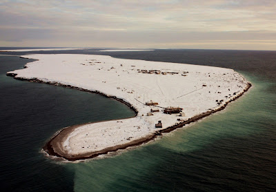 A small group of island on the west side make up the Sedov Archipelago. Two of these smaller islands happen to be 'inhabited' in a special manner: Sredniy Island has an air strip for a military base under improvement, plus... a museum ! - and the minuscule Golomyanniy Island is home to a small meteorological station at work since 1954.