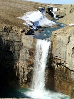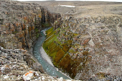 Somerset Island is under an ice cap in the cold season, but in springtime the melting of ice uncovers deep canyons all across the land.