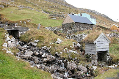 The old watermill with grass roofs is still well preserved.