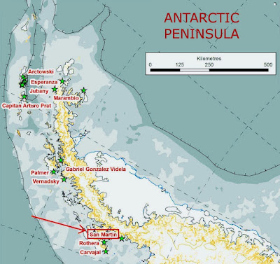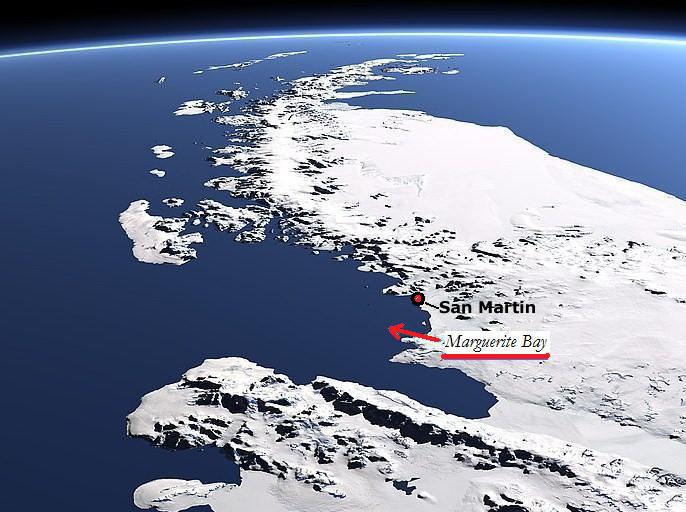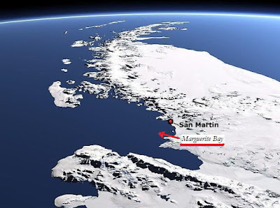 Marguerite Bay (Bahía Margarita), on the west coast of the southern tip of the Antarctic Peninsula, was chosen for its relatively mild climate and friendly shores to be the location of several antarctic polar stations. I've written about Rothera (UK) sometime ago, and in its vicinity is San Martin, an Instituto Antártico Argentino (IAA) base.