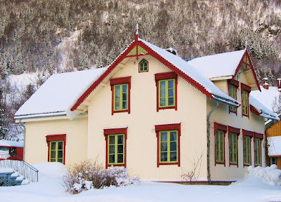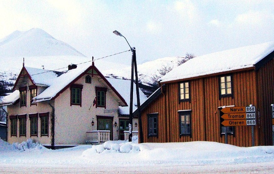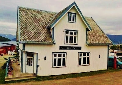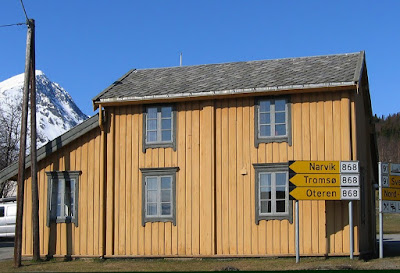 The bakery (right) dates back to the 19th century; it was usually the first shop to open in a new settlement. The ochre house is probably the oldest structure in Lyngseidet, with wood-panelled walls typical of the era.