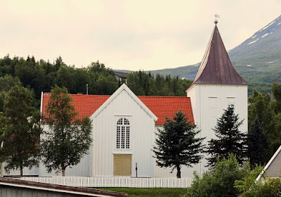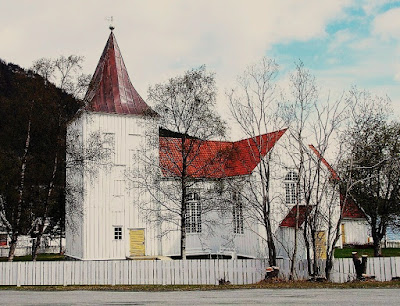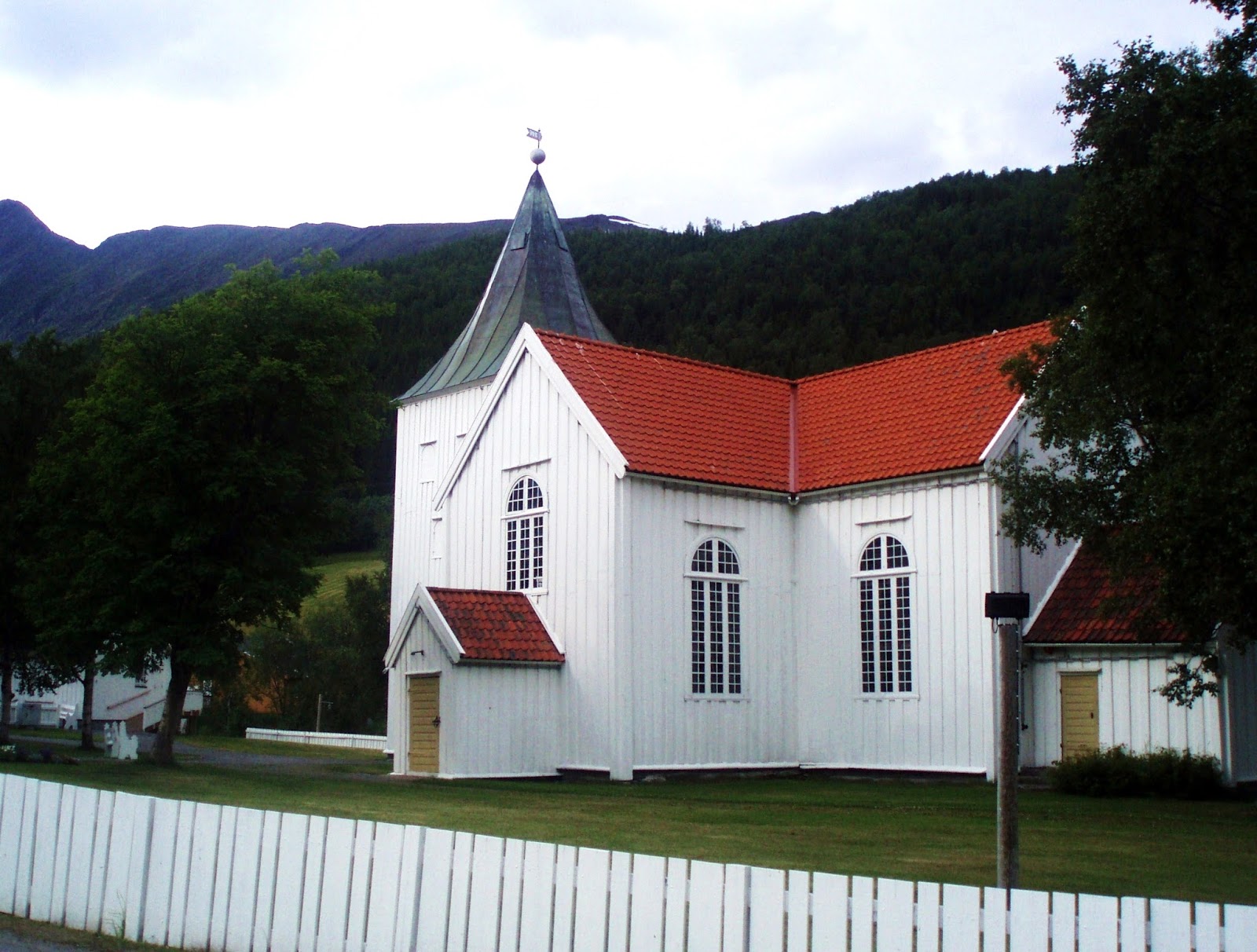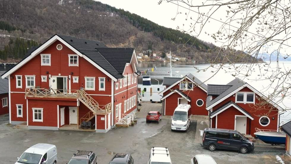 The small center around the ferry pier includes the church (down, left), the old bakery (center), the library, the post and grocery (red building, right), and the Strandveien coastal street bordering the fjord down to the Sorheim Brygge lodges. Small but friendly.