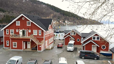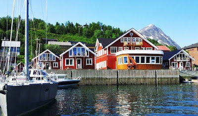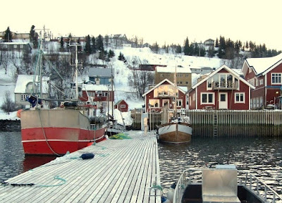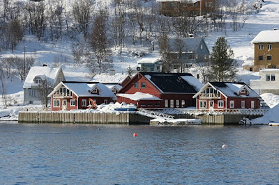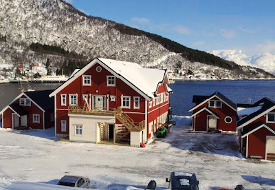 On the old quay, some rorbuer (red cabins) still face the fjord - they are now tourist lodgings.