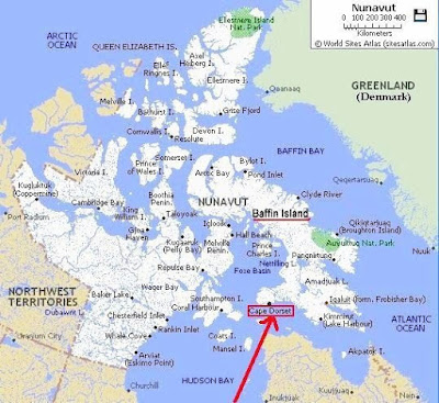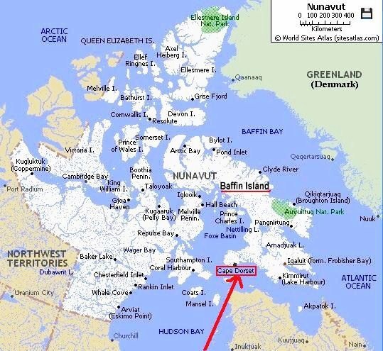 Cape Dorset Inuit: Kinngait, high mountains) is situated on flat ground at Dorset Island, close to Foxe Peninsula at the southwestern tip of Baffin Island. Surrounded by arctic landscapes, Dorset Island supports many forms of arctic wildlife, including herds of caribou or, sometimes, a wandering polar bear or two, and in Summer arctic wildflowers dappling the tundra valleys with vivid colours.