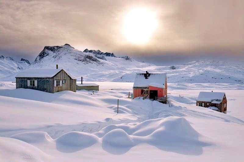 A handful of small wooden houses, some painted in vivid colours, perched on an ice slope overlooking the fjord.