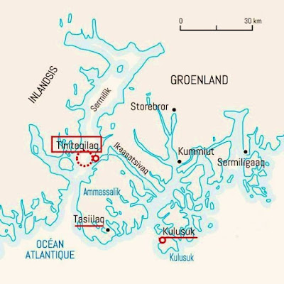 Tiniteqilaq is just a smaller and inner village on the Sermilik fjord, rather difficult to access except by helicopter.