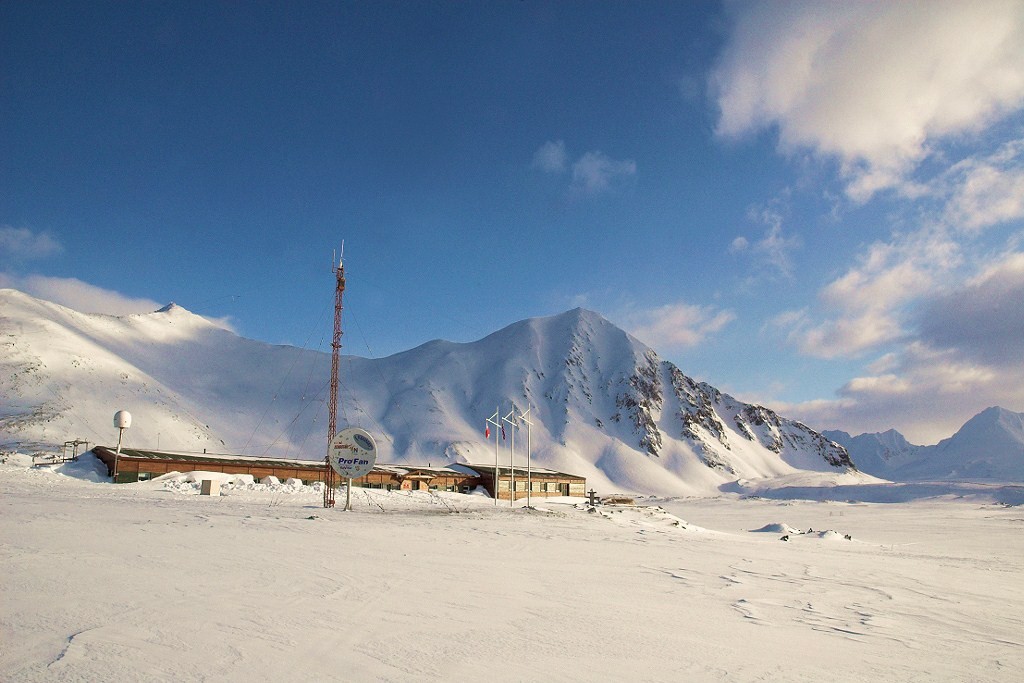 The station sits on a flat marine terrace in Isbjørnhamna bay.
