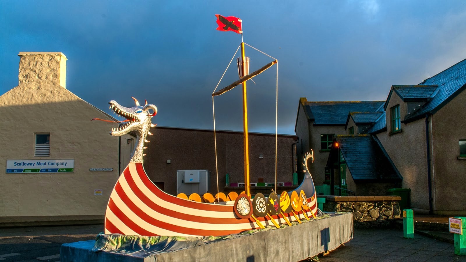 The Scalloway Festival has a procession of torch-bearing guizers, accompanying a Viking longship (or “galley”) through the village from Lovers Lane, singing and cheering all the way down New Street and onto Main Street.