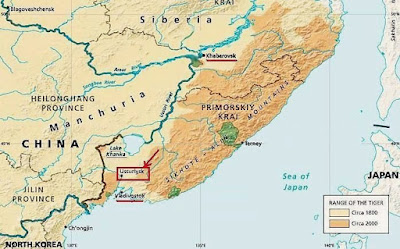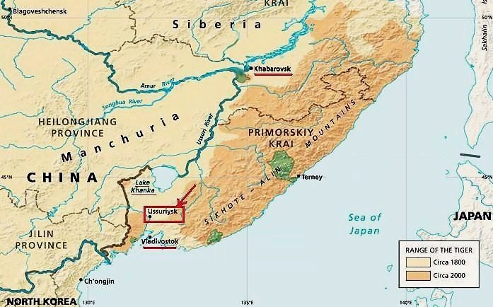 The Primorsky Krai and the Ussuri Tiger living grounds (dark orange).