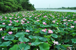 Lake Khanka´s waters covered with flowered lotus.Ussuri River