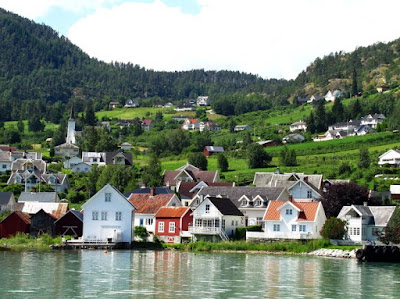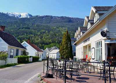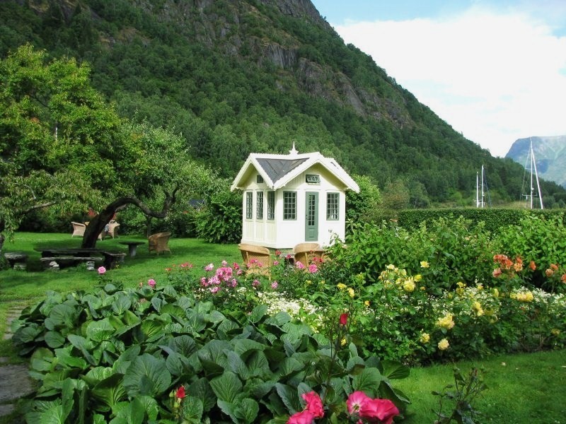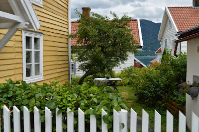 The charm of Solvorn - colourful wooden houses with fenced gardens with a view to the fjord.