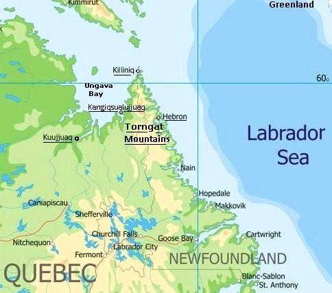 The mountain range extends from Davis Inlet (Quebec), in the south, through east Labrador, to the Killiniq Island in the northern extreme.