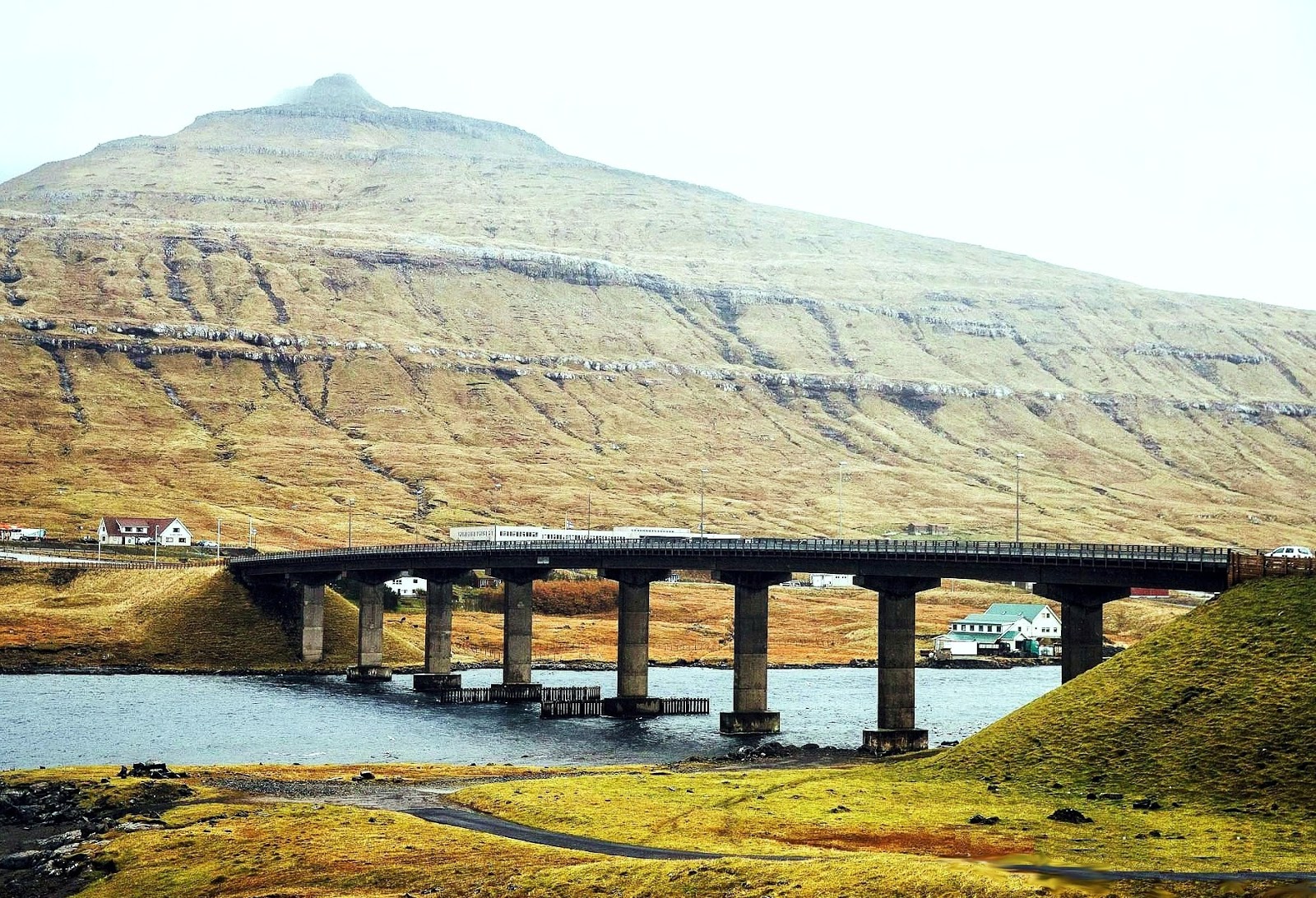 This bridge Brúgvin um Streymin jumps across a narrow ocean straight between two islands of the Faroese archipelago; it does not feel like you're over the ocean, though: the waters of the shallow Sundini Straight are usually quiet, in spite of strong currents.