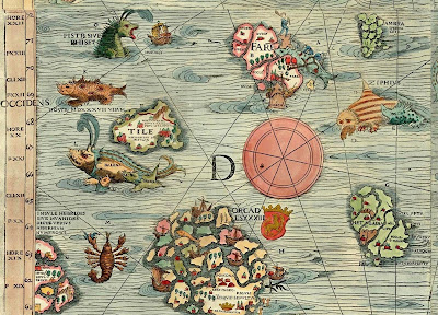 It's also amazing that Olau Magnus maps the whirlpools, the Maëlstrom by the Lofoten Islands (noted 'horrenda Caribdis') and others where the Gulf stream meets the cold Arctic waters; unable to see all those from above - no satellite or air view - how could he identify and locate them with such a precision ?