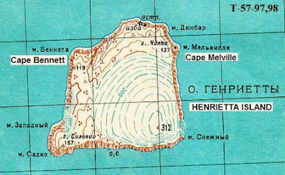 Henrietta Island (Russian: Остров Генриетты, Ostrov Genriyetty) is the northernmost island of the archipelago. Almost half of it is covered by a central ice cap that reaches its maximum height at 312 m. Cape Melville (Mys Mel'villya) and Cape Bennett (Mys Bennetta) are the two main features.