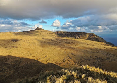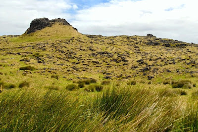 The main features are the craters, the green Phylica and grass cover, and the rugged southwest coast.
