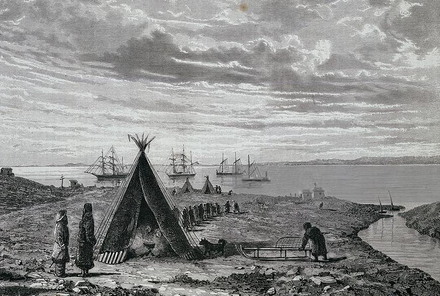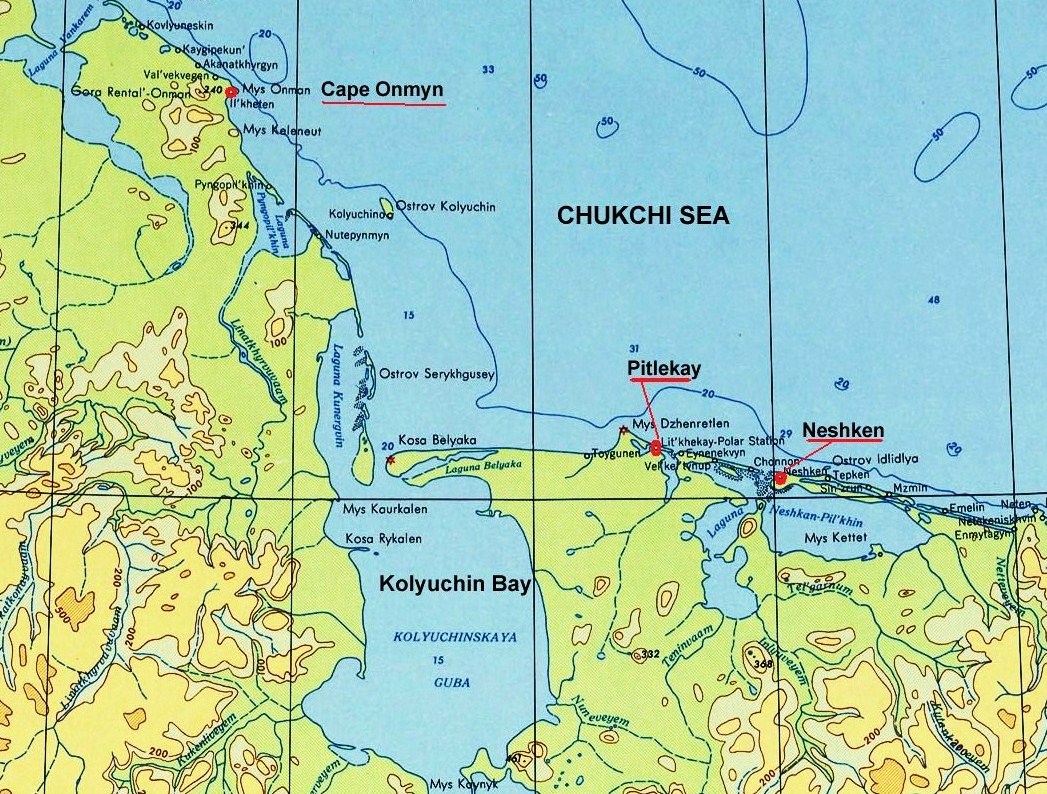 The coastal land around was desolate and monotonous, but it was not uninhabited. A small settlement, "Pitlekay" (Pitlekaj, Pilgykey), was a few kilometers from the vessel and further away there were more similar settlements, like Neshkan at 172º 58' W, and Uelen farther to the East, a day trip away.