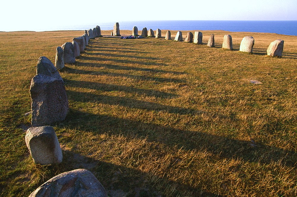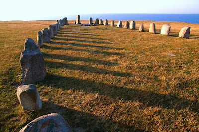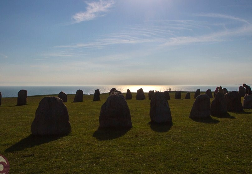 Datation is well established, between 500 and 1000 AC, during the late nordic Iron Age. But archeologists discovered that the stones stand on a much older funereal camera from ca. 5500 years ago. Maybe the alignment in the form of a ship's keel meant the transport of the underlying deceased to their eternal abode? But here, so far away from Caronte's bark ????...