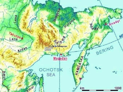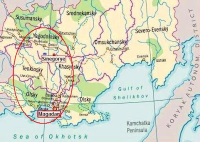 Camp Dalstroy, a gulag on the upper basin of the Kolyma in the neighbourhood of the abandonned mining village of Sinegorye, rose up to 200 000 prisoners packed in abject conditions. They worked in the Uranium and Gold mines and building the tragic road R5O4 to connect Yakutsk and Magadan.