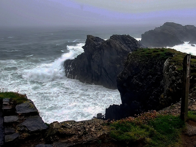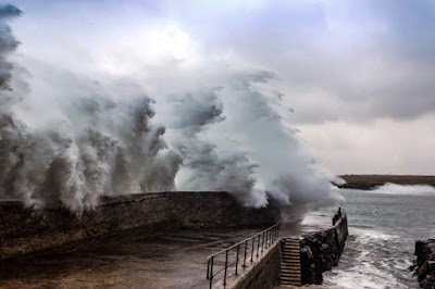 Sea storm conditions are frequent, huge waves battering the walls.