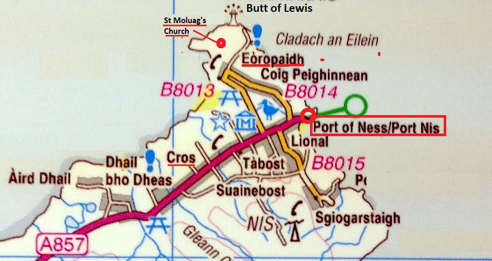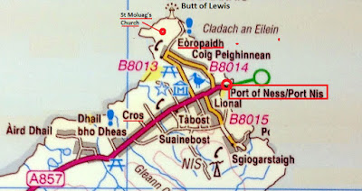 As I said, Port of Ness is a village-along-the-road. The main road from Stornoway is also its main street. Below I pasted a map of road A857 that shows the location of some features I'll describe next. All the area north of Cros is the community of Ness.