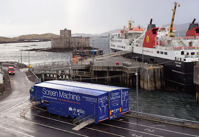 The 'Screen Machine', a comfortable 80-seat digital mobile cinema, is brought by ferry to Castlebay.